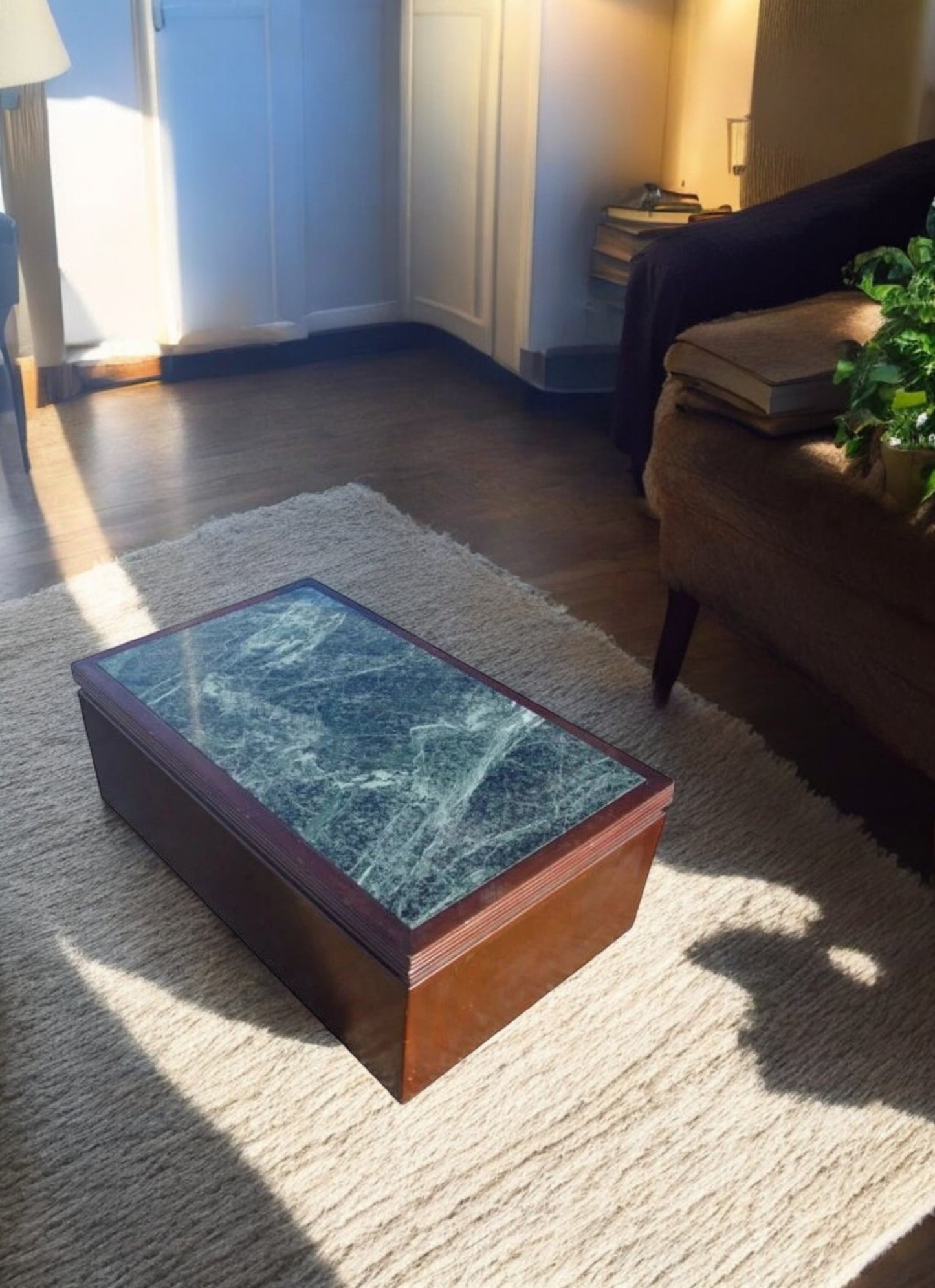 40″ x 24″ Rectangular Wood And Marble Pedestal Coffee Table The pedestal is mahogany Green marble inlays and molding around the marble top and at the base Chrome trim around the pedestal Matching side table available; Sold separately