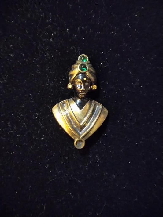 Sterling Silver and Gold Plated Brooch of Moor Wearing Tuban w/ Green Stones