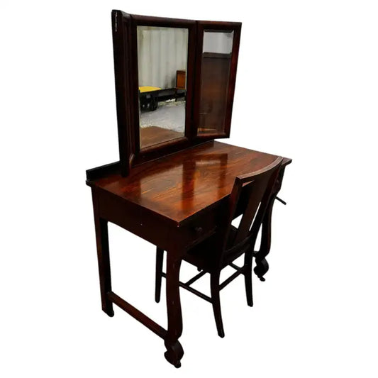 Antique Empire Revival Burl Walnut Tri-fold Mirror Vanity and Chair