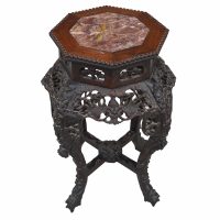 Antique Chinese Carved Teak Wood Floral Table with Marble Insert