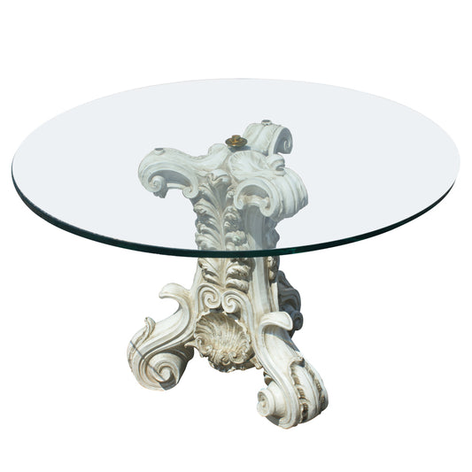 32″ Mid Century Coffee Table with Carved Ornate Base and Glass Top
