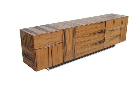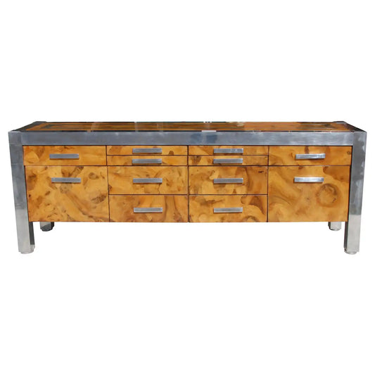 Leon Rosen for Pace Collection Burled Wood and Chrome Credenza