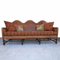 Vintage Arched Back Leather Sofa with Needlepoint Pillows