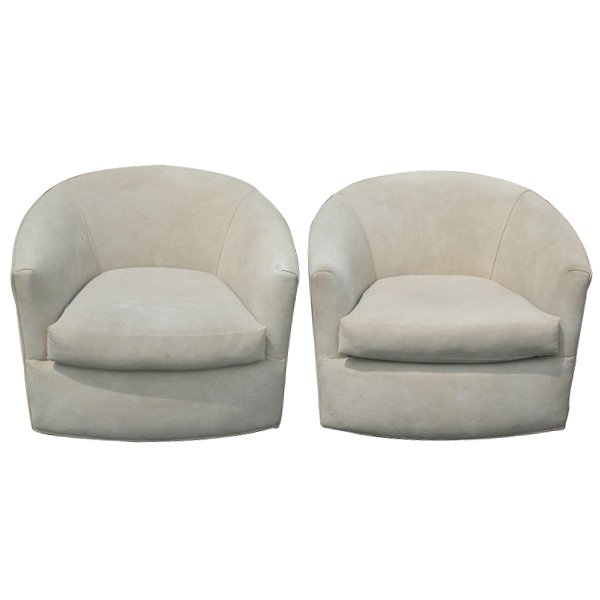 Pair Club Lounge Armchairs Milo Baughman Style 1970`s style Off white putty suede type upholstery Detachable cushions On casters