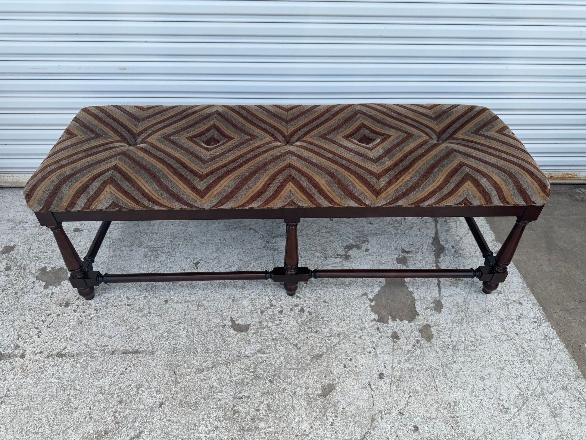 Cognac-stained frame, sand, & cocoa brown fabric, solid wood frame, fabric cushioned top- all these are the features of this geometric bench.