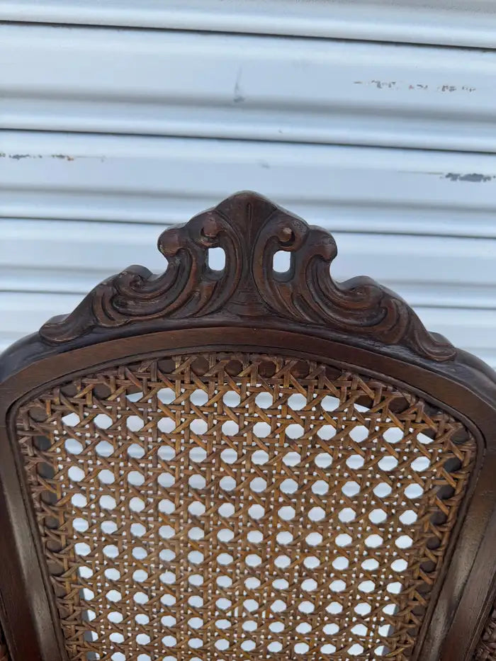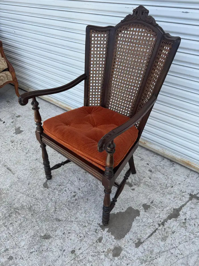 Antique Carved Wood Armchair with Cane Back