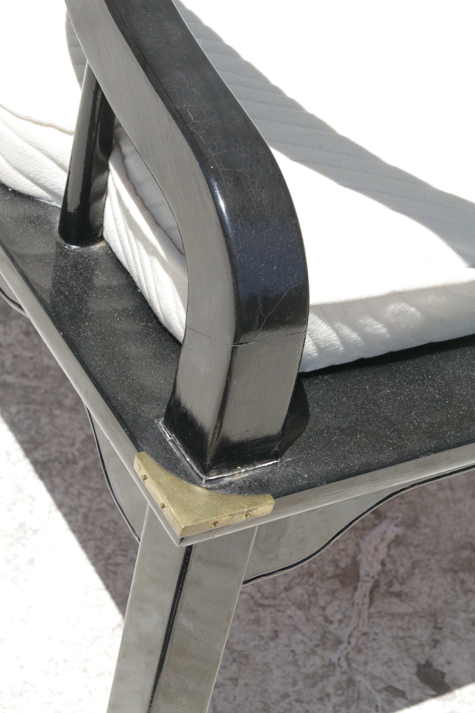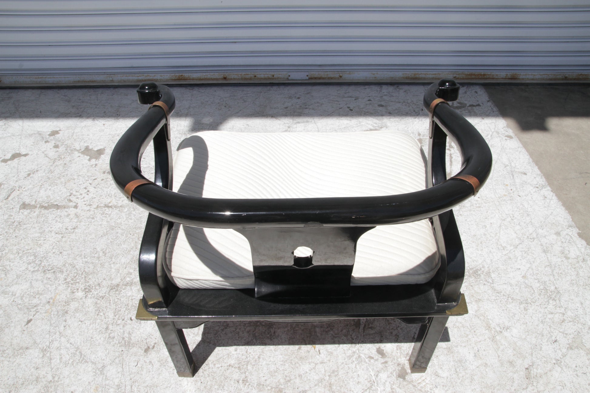 Asian modern black lacquered horseshoe back lounge chair with brass fittings in a beautiful glowing condition.