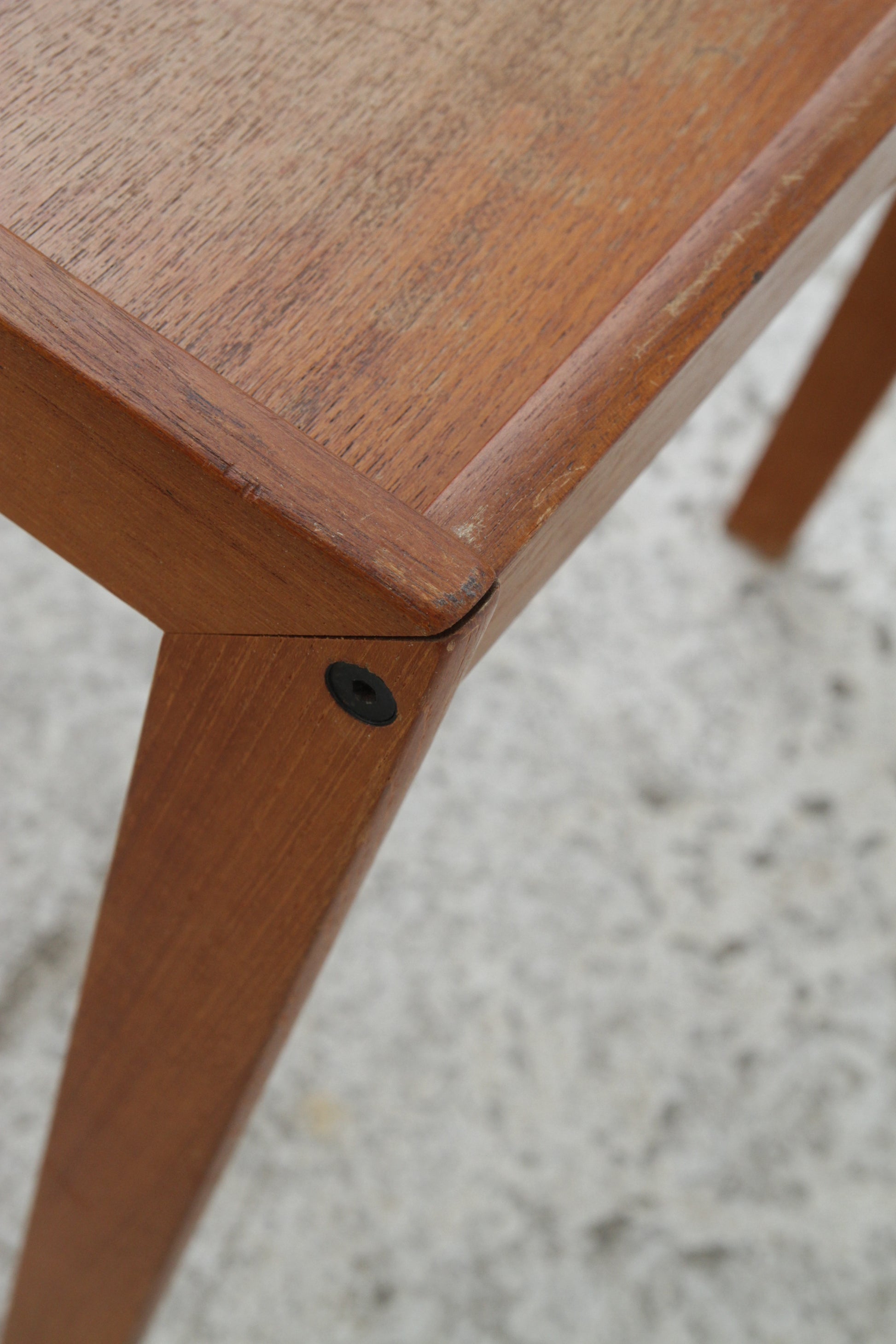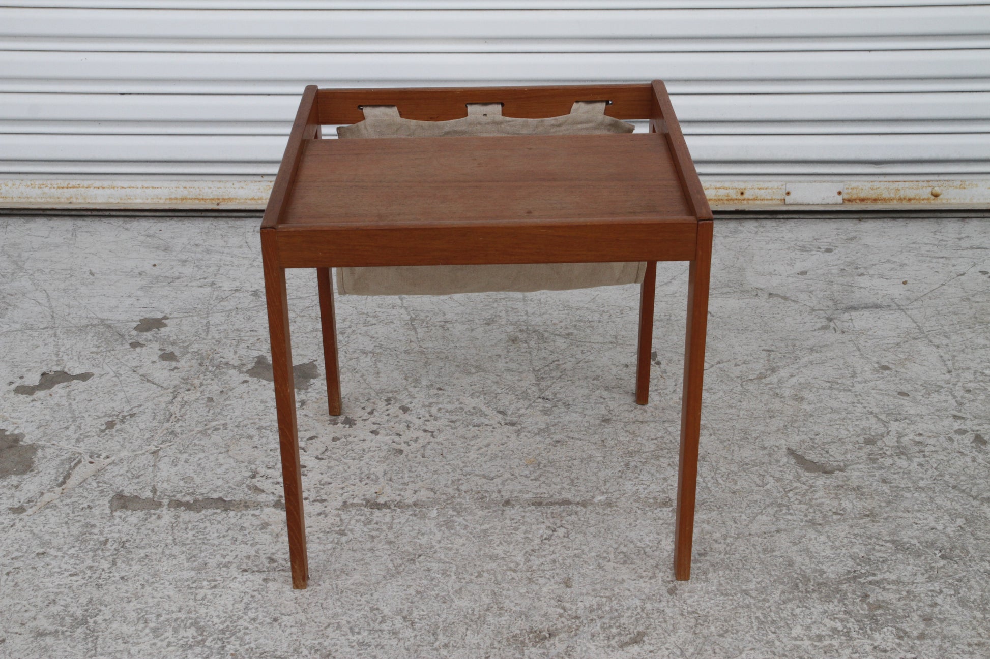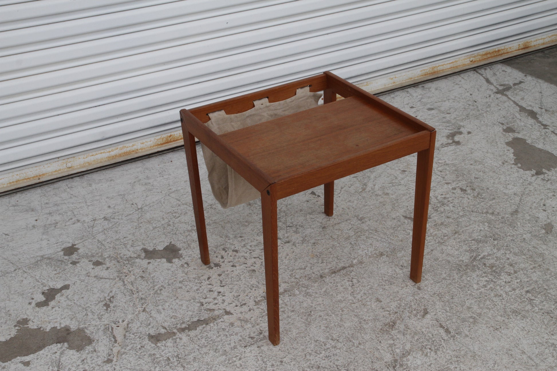 Modern table features solid teak construction with canvas sling magazine holder and tall tapered legs.