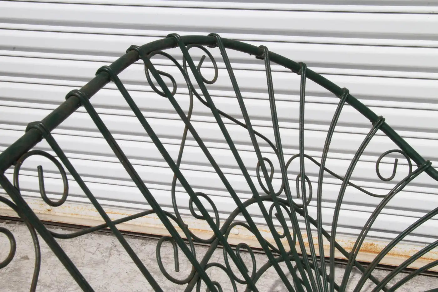 Charming 20th century wirework garden bench with scrolled design accents. Painted in a deep forest green.
