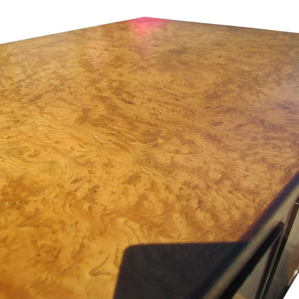 A prime piece of furniture in burled elm veneer (over oak wood) by John Widdicomb. Dresser features Inset brass pulls in the "campaign" style allow for ease of use and style. Signed "John Widdicomb, Makers of fine furniture, Grand Rapids, Michigan".