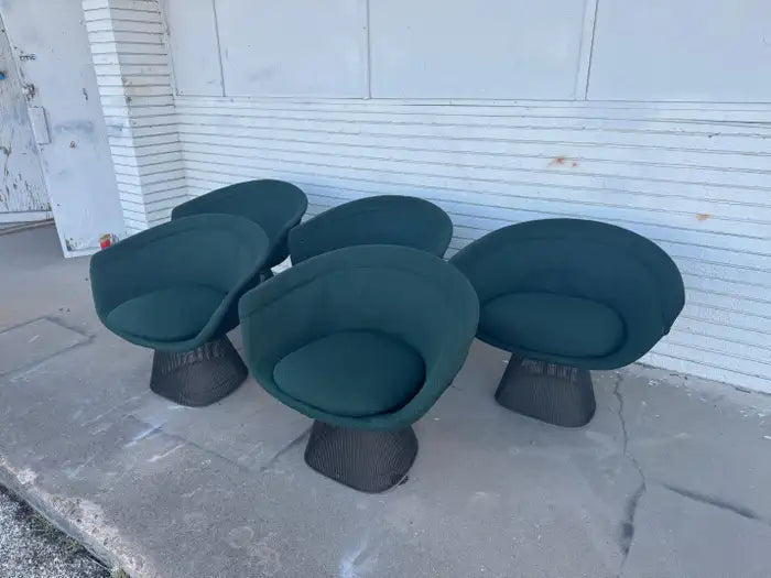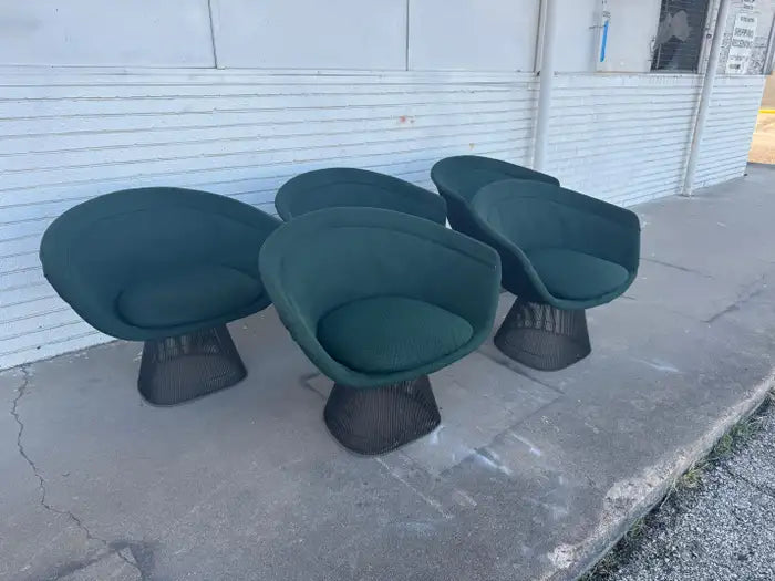 Set of 5 Warren Platner classic lounge chairs. These chairs were manufactured by Knoll. They're in nice original condition with a Pine green fabric that's original to the chairs. We strongly recommend reupholstering. Also retains original Knoll labels.