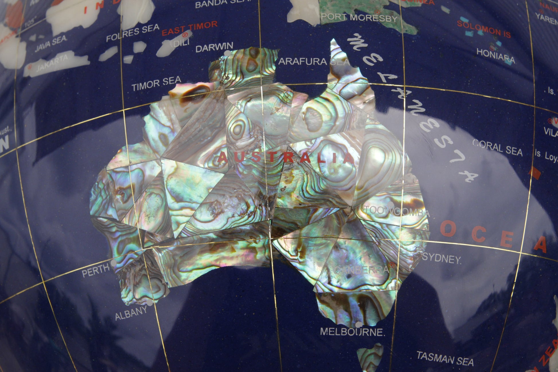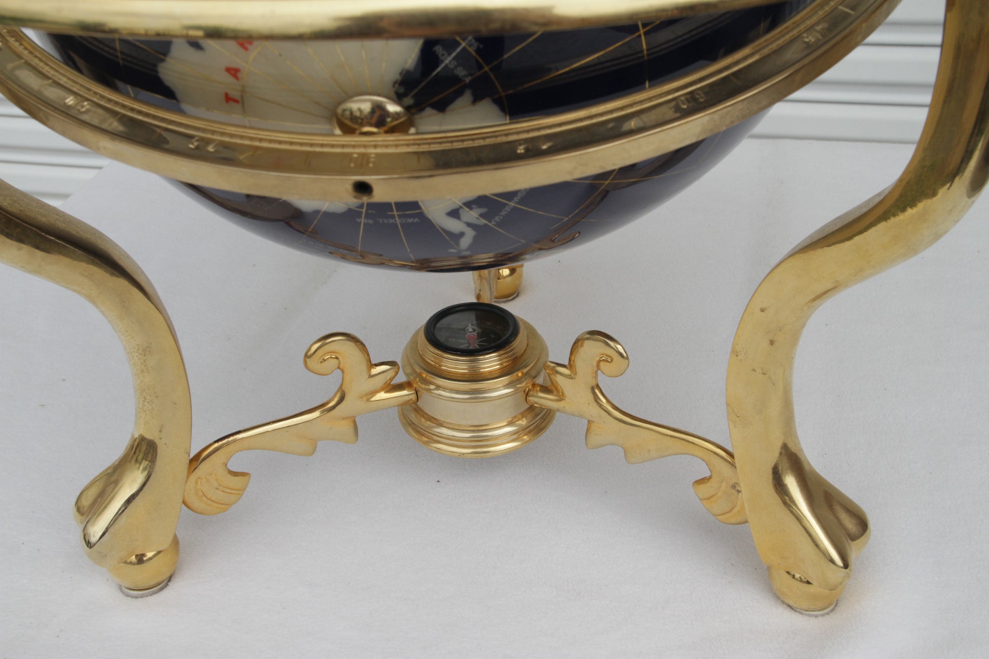 Captivating Pietra Dura globe featuring marble, mother-of-pearl and other semi-precious stones suspended in a solid brass mount. The brass tripod turns 360 degrees and tilts. The sphere is very heavy and solid with a compass below.