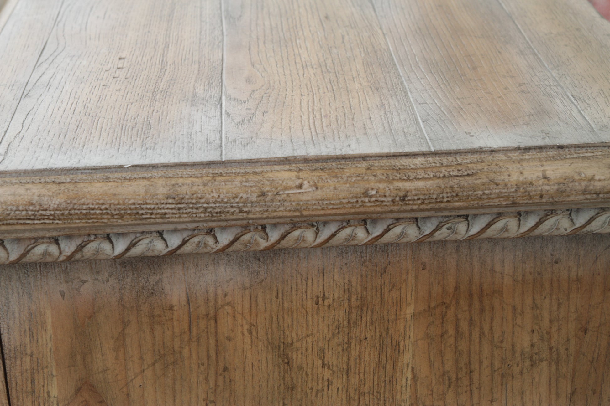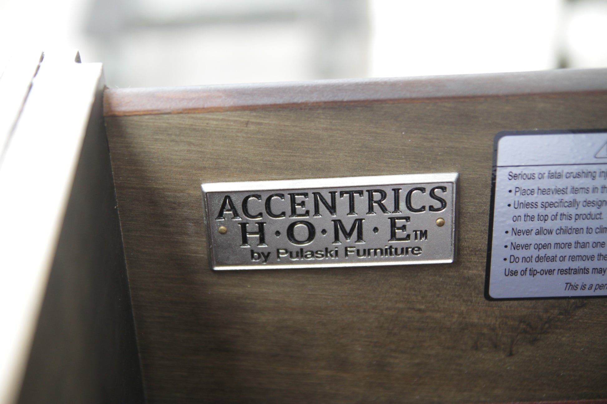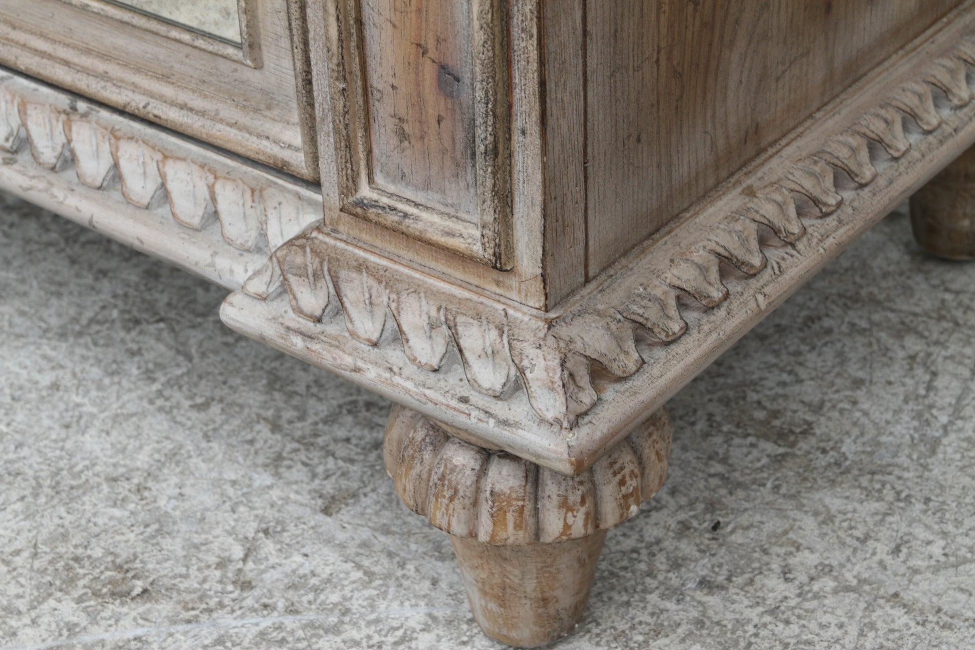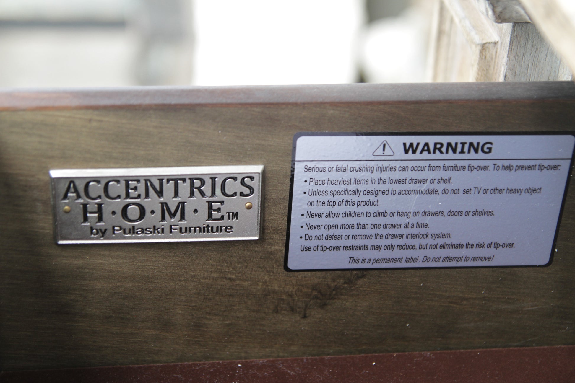 The Nightstand is elegantly designed with reeded pilasters, decorative rosettes, framed drawers and distinct bail pulls. The Nightstand has three antiqued mirrored drawers with the top one lined in felt and each featuring ball bearing side drawer guides and dust-proofing. With pecan veneers and select solids, the nightstand is finished with a rustic aged finish.