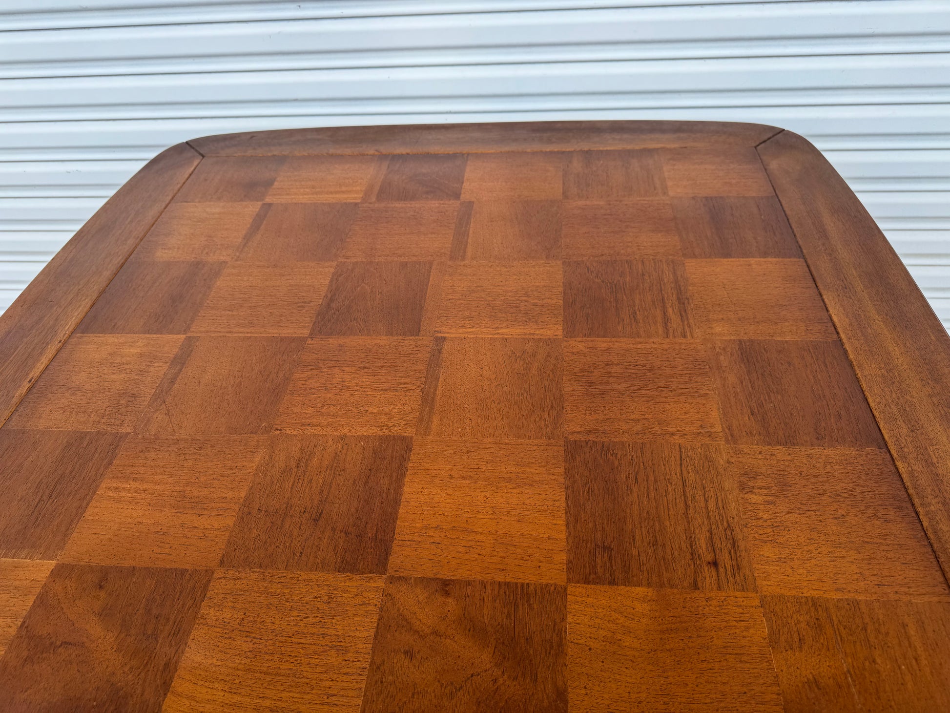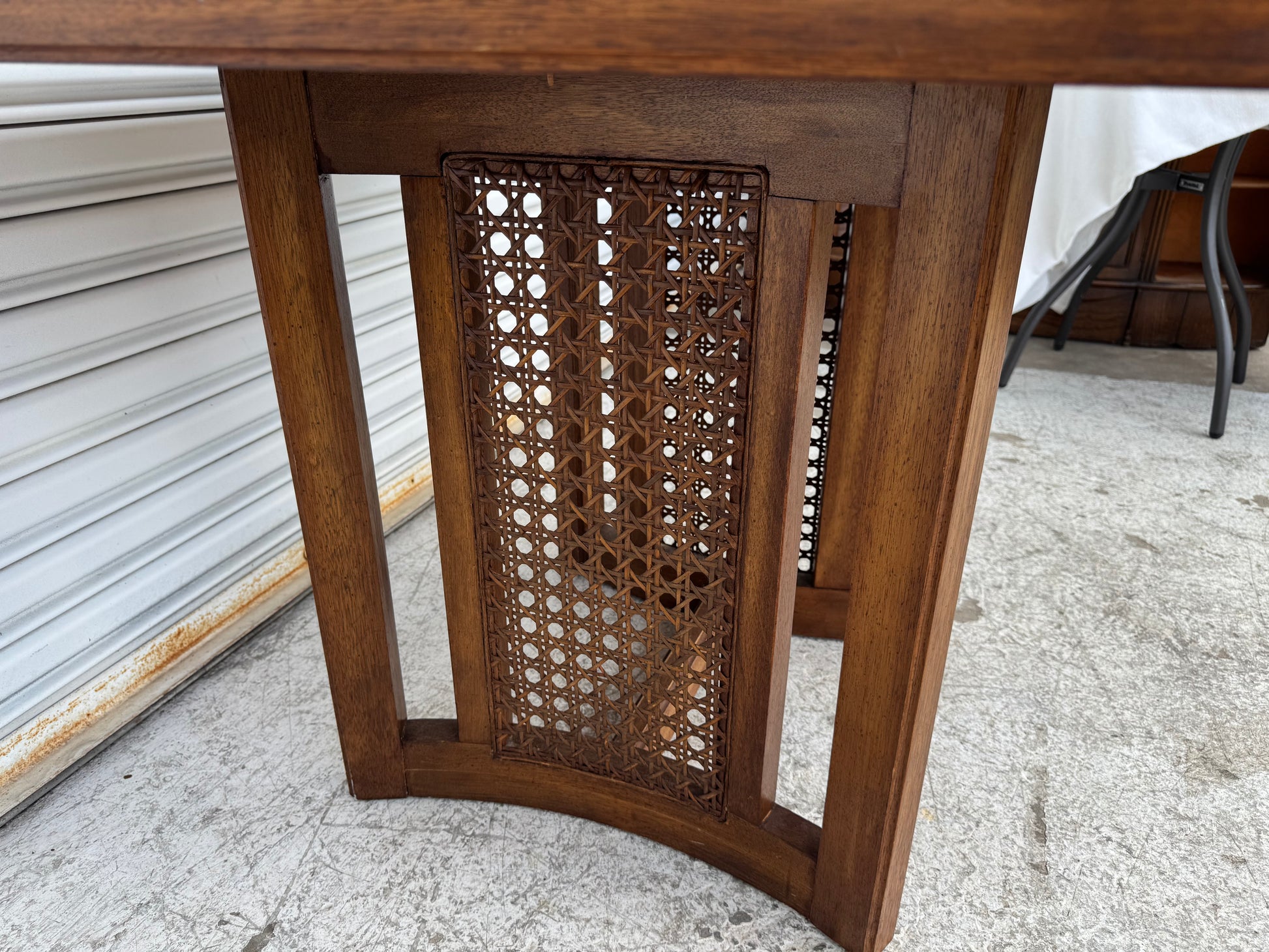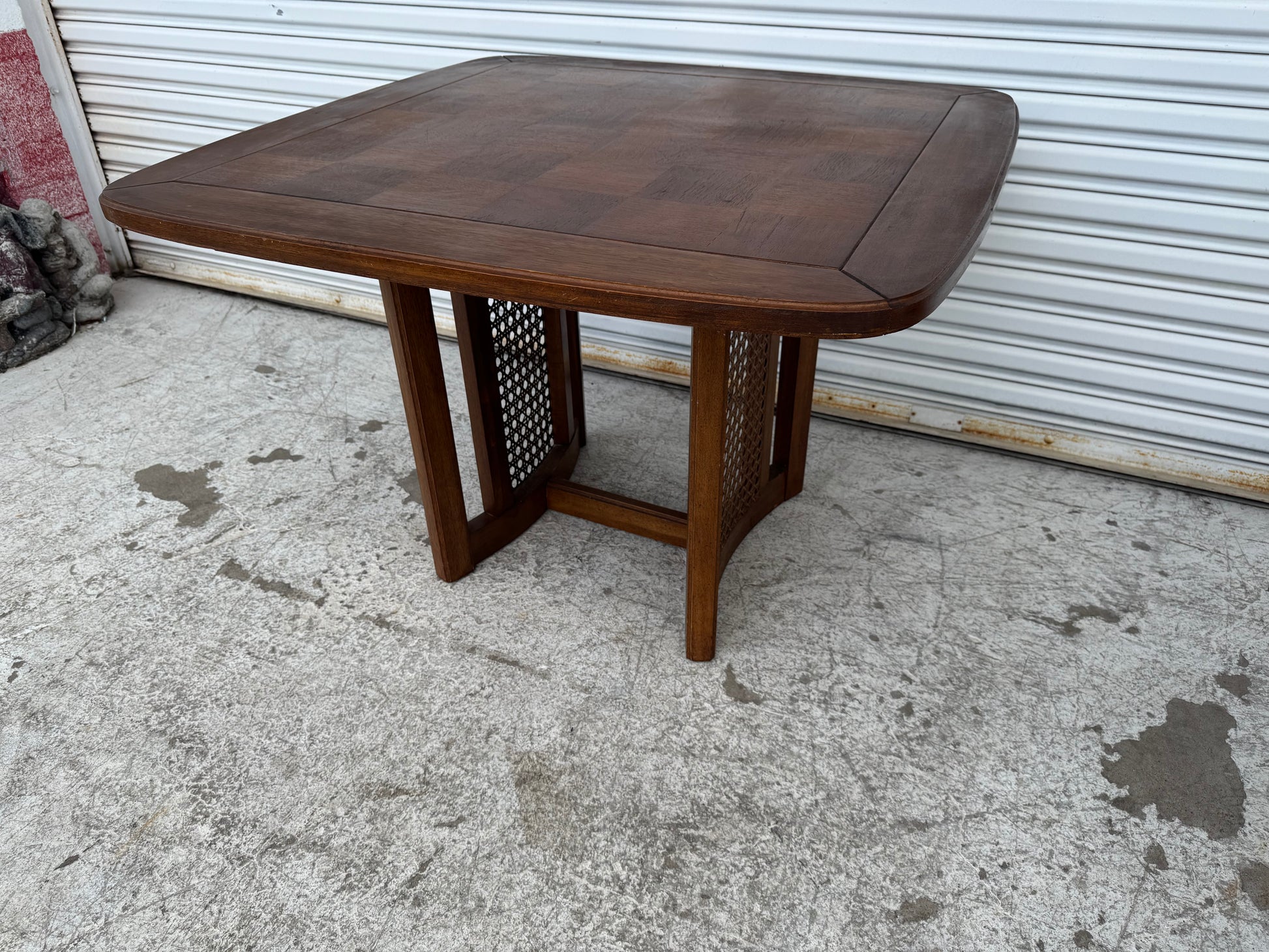 A gorgeous 1960's table that holds a beautifully grained 5" squares tabletop with distinctive rounded and beveled framing. Take note of the unique base composed of two elegantly curved cane structures. Think sunroom, breakfast nook, afternoon cocktails, late-night poker den.
