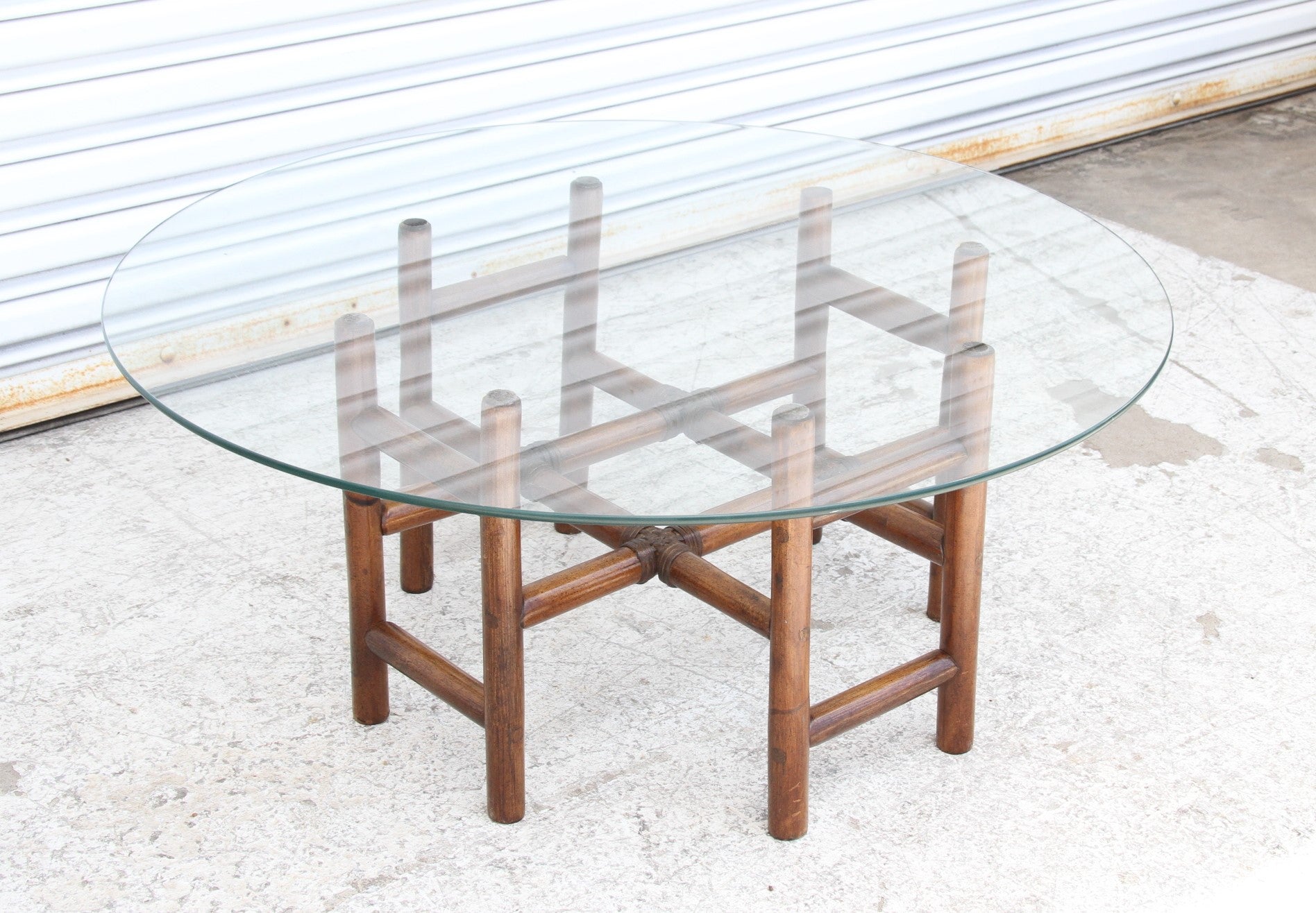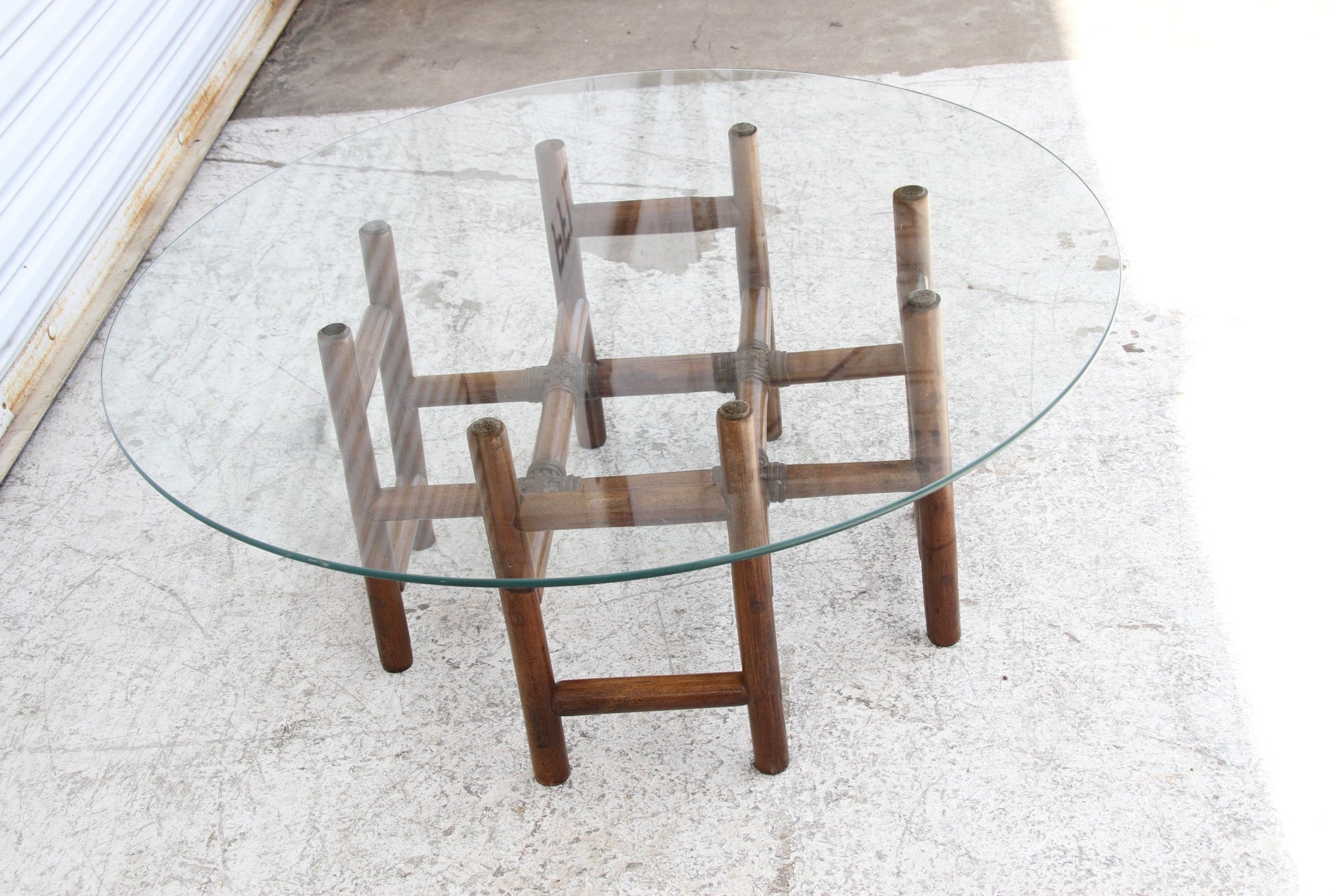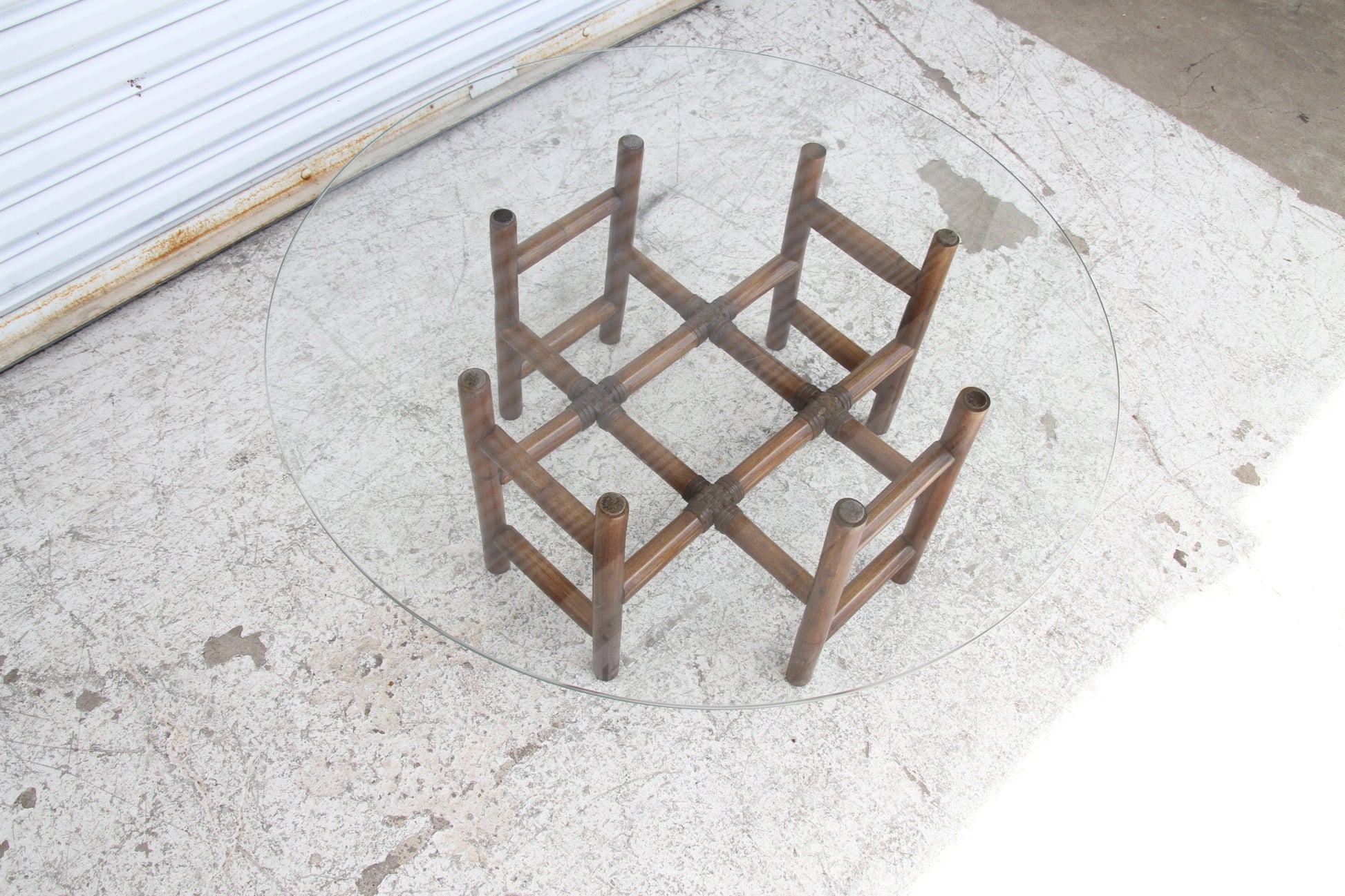 The bamboo is lashed together with leather rawhide straps. The table has eight legs making a beautiful geometric design. The structure is in very good condition. The glass is finished with a thick beveled edge.