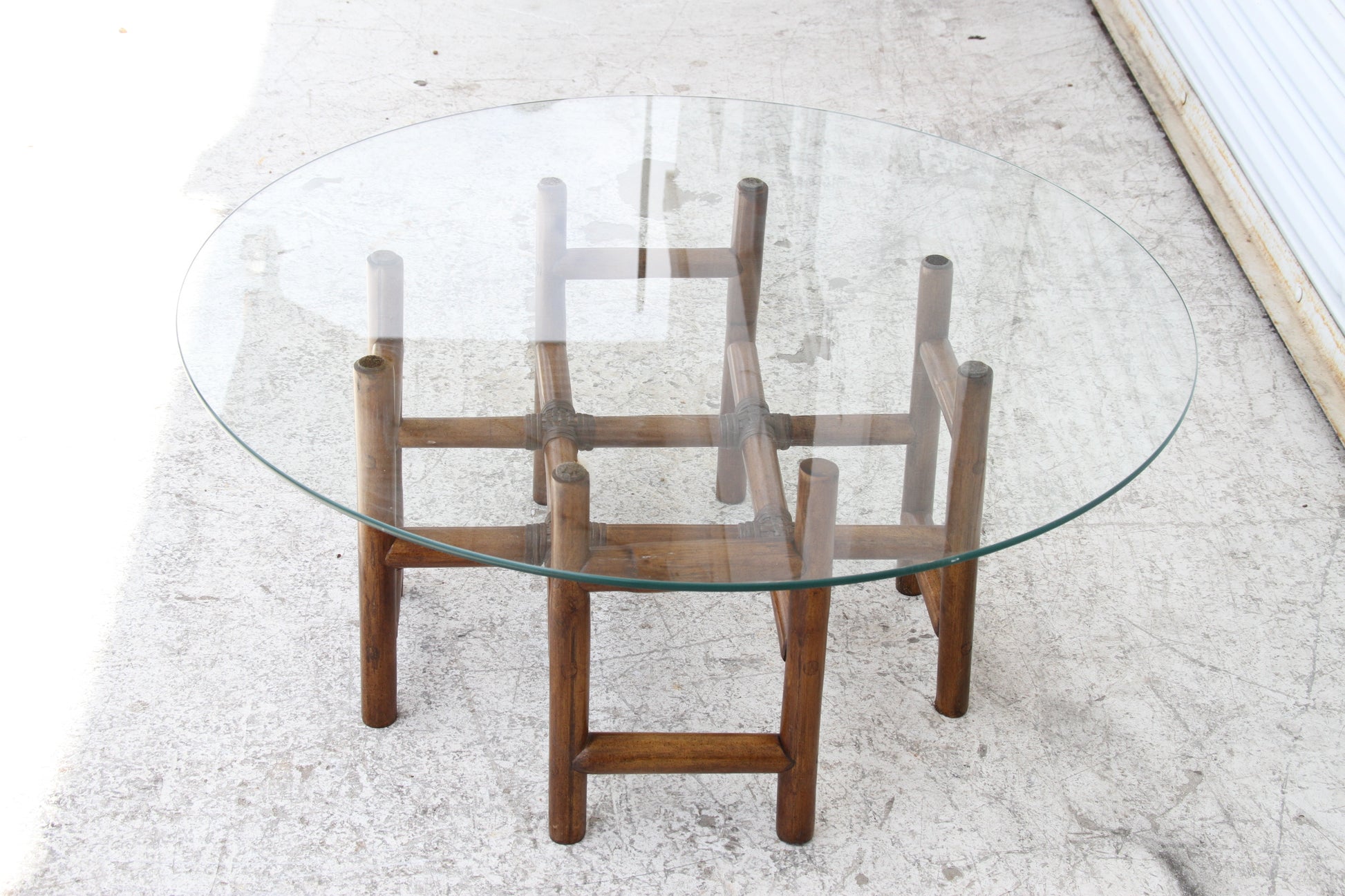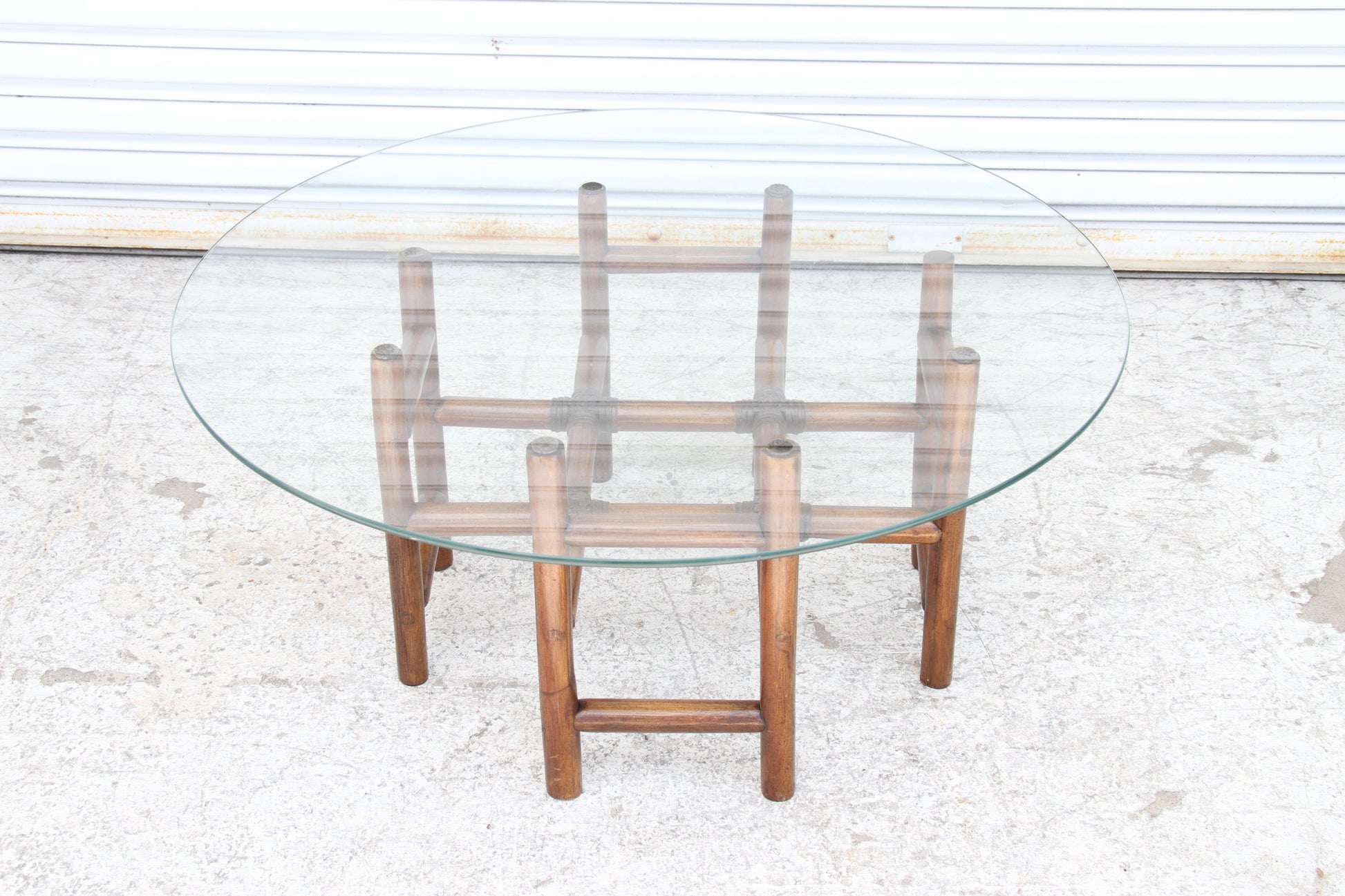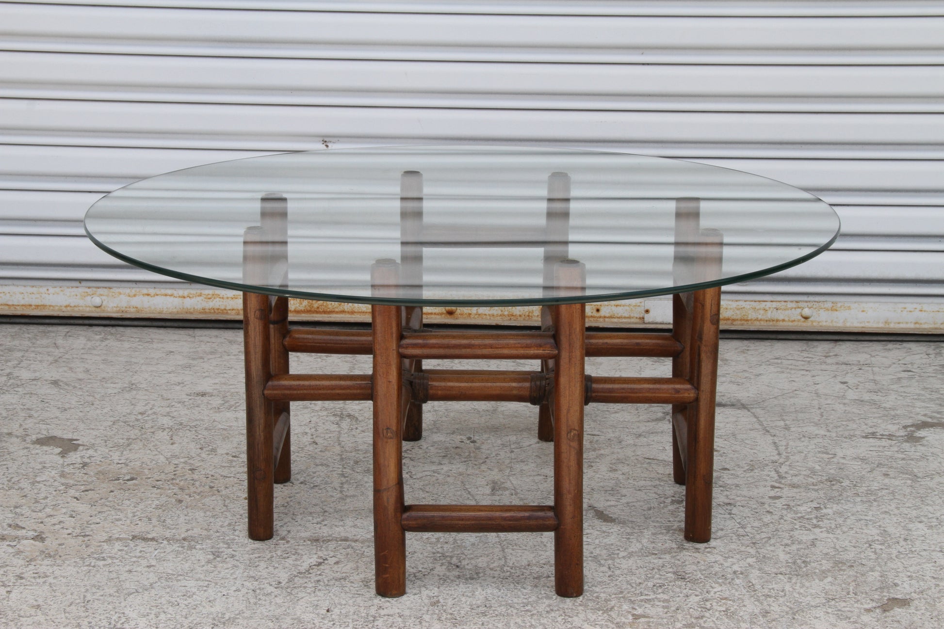 The bamboo is lashed together with leather rawhide straps. The table has eight legs making a beautiful geometric design. The structure is in very good condition. The glass is finished with a thick beveled edge.