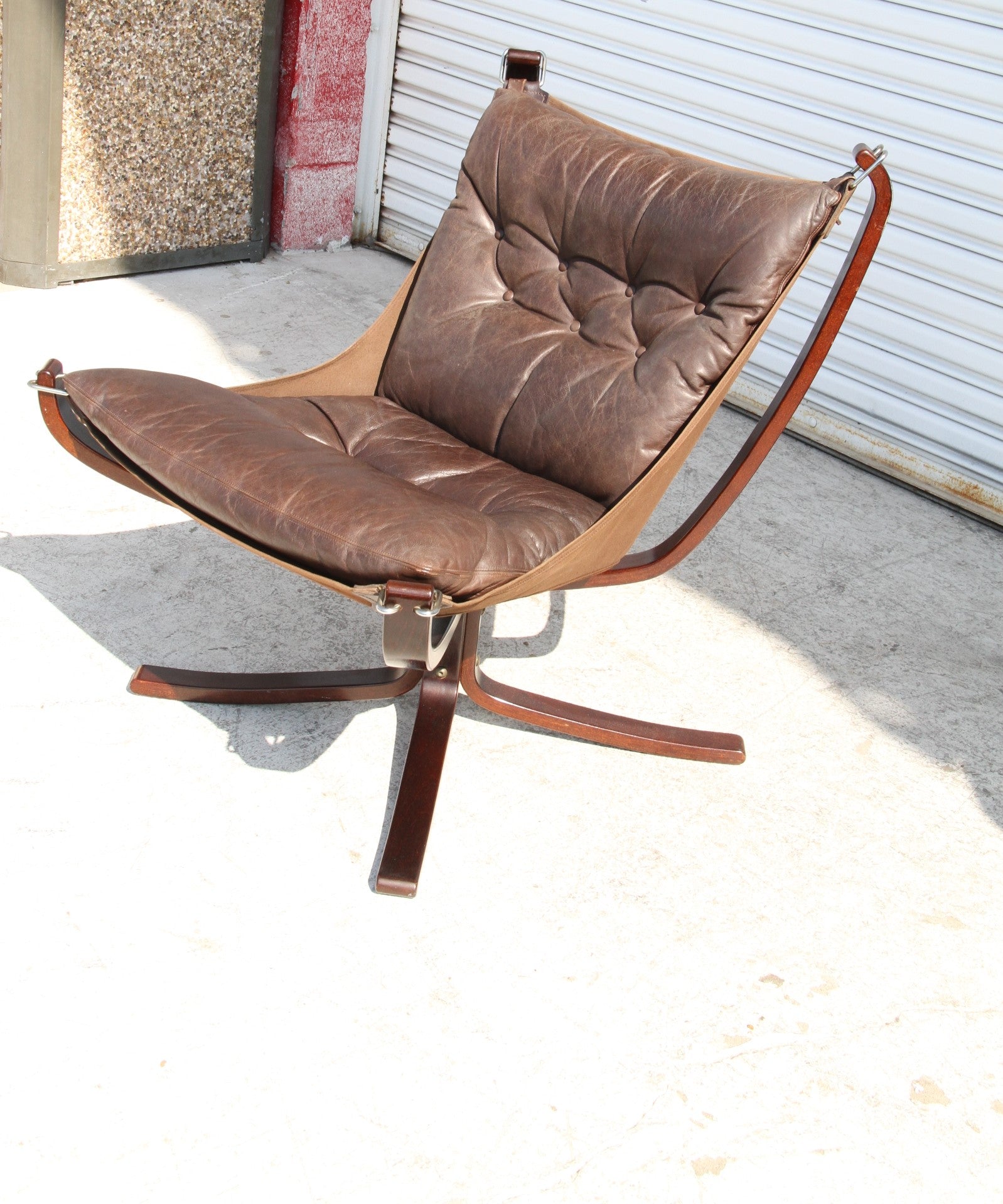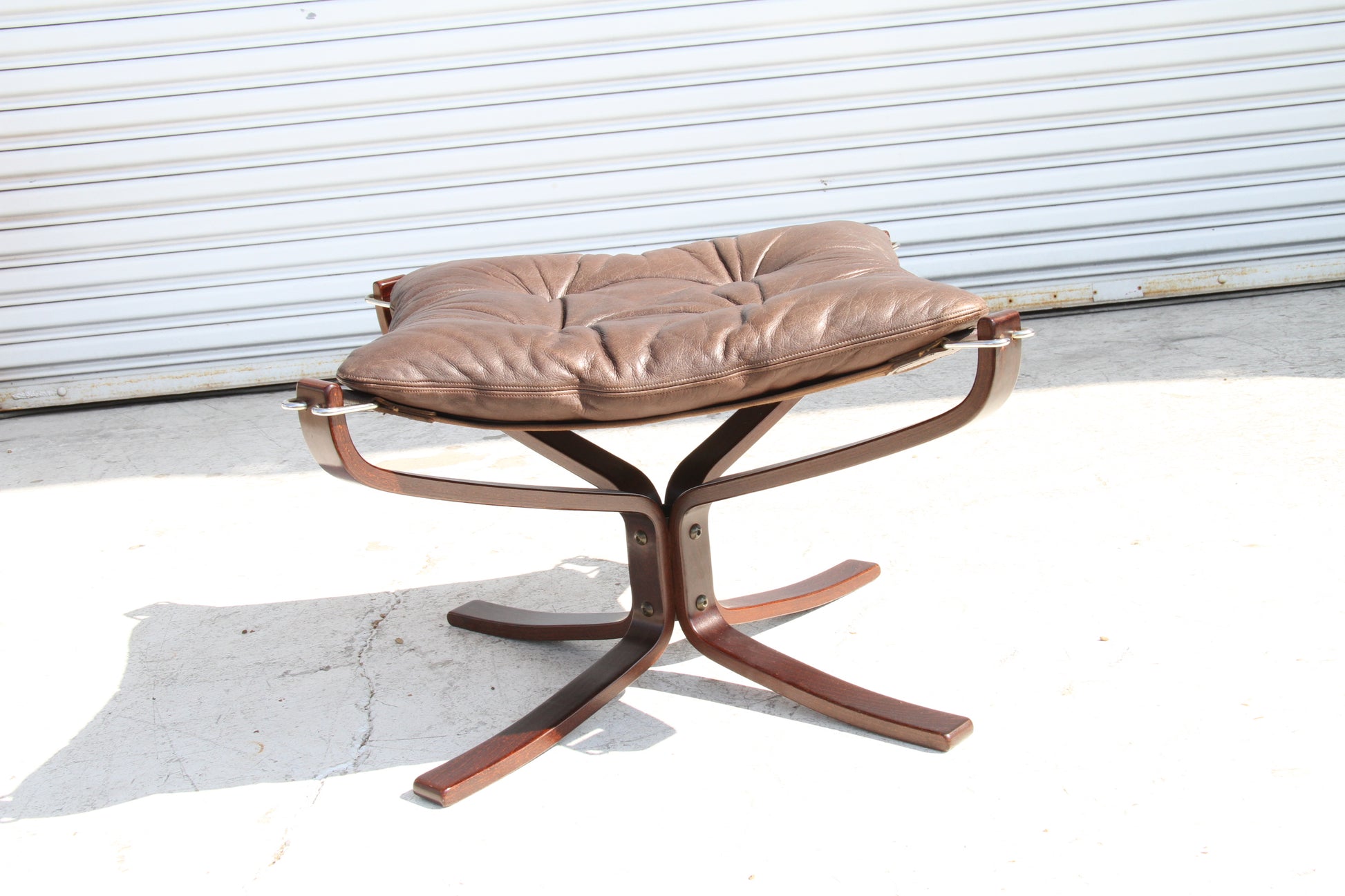Sit back and relax at this beautiful low back extremely relaxing lounge chair and ottoman in 1970. Falcon is a true icon of its time made of bent plywood and a removable cushion that comes in grainy texture and brown color leather. The canvas base is mounted on wood frame with metal buckles. The chair is in a quite good vintage condition with no defects but with a few slight traces of use considering its age.