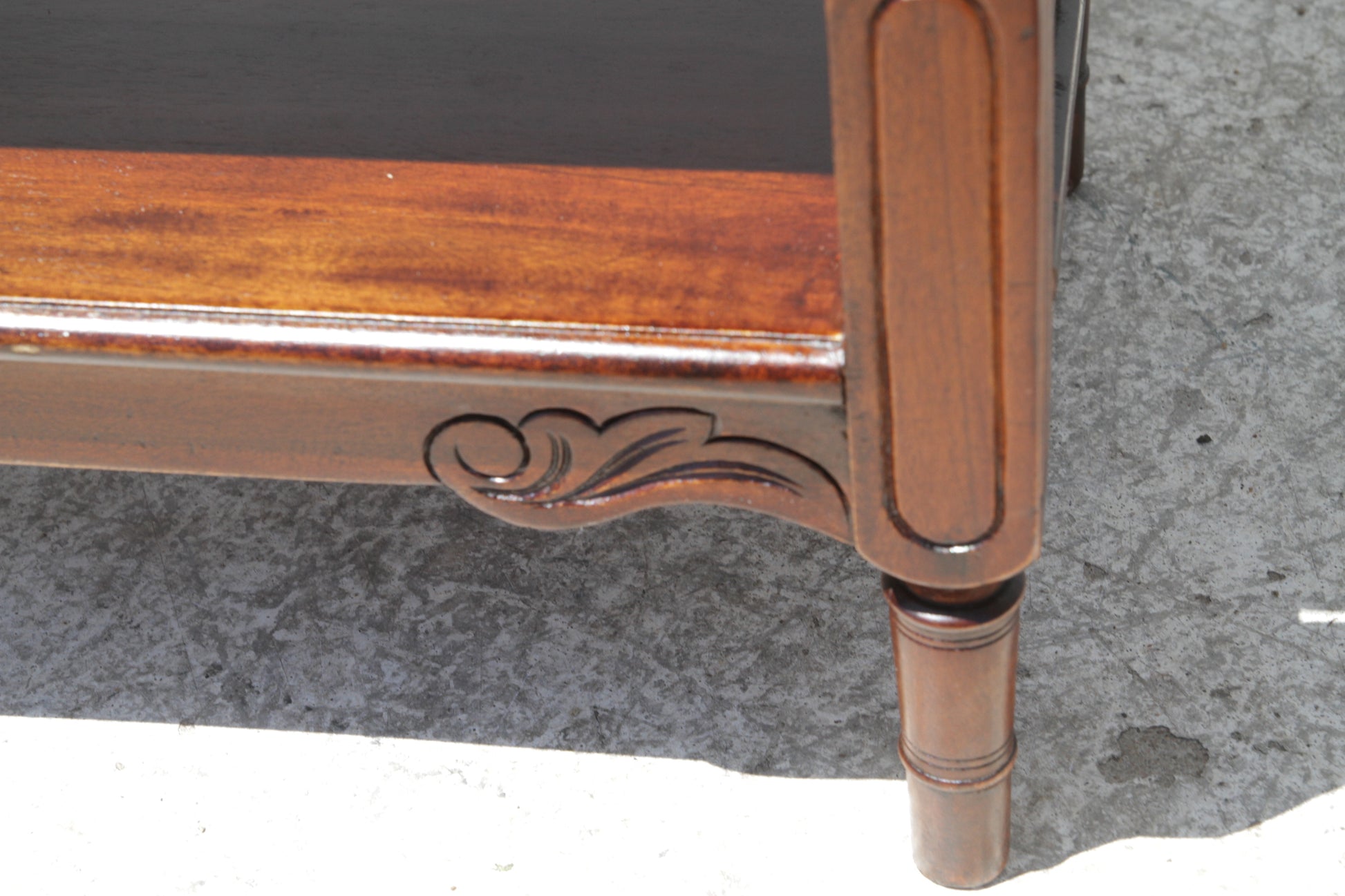 This is a gorgeous vintage mahogany console table, hall table, or Cheveret desk with mirror, two drawers, and two shelves. Has elements of Victorian Eastlake and Louis XVI designs.