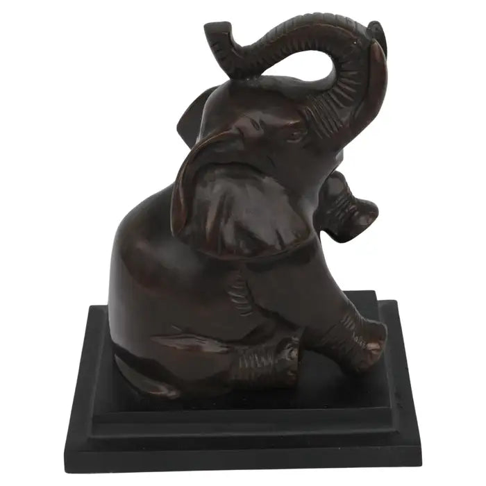 Vintage Pair of Art Deco Baby Elephant Bookends. Crafted from sturdy metal with a rich bronzed finish, these delightful bookends showcase baby elephants in a playful, seated pose—each with a raised trunk, symbolizing good luck and positive energy.